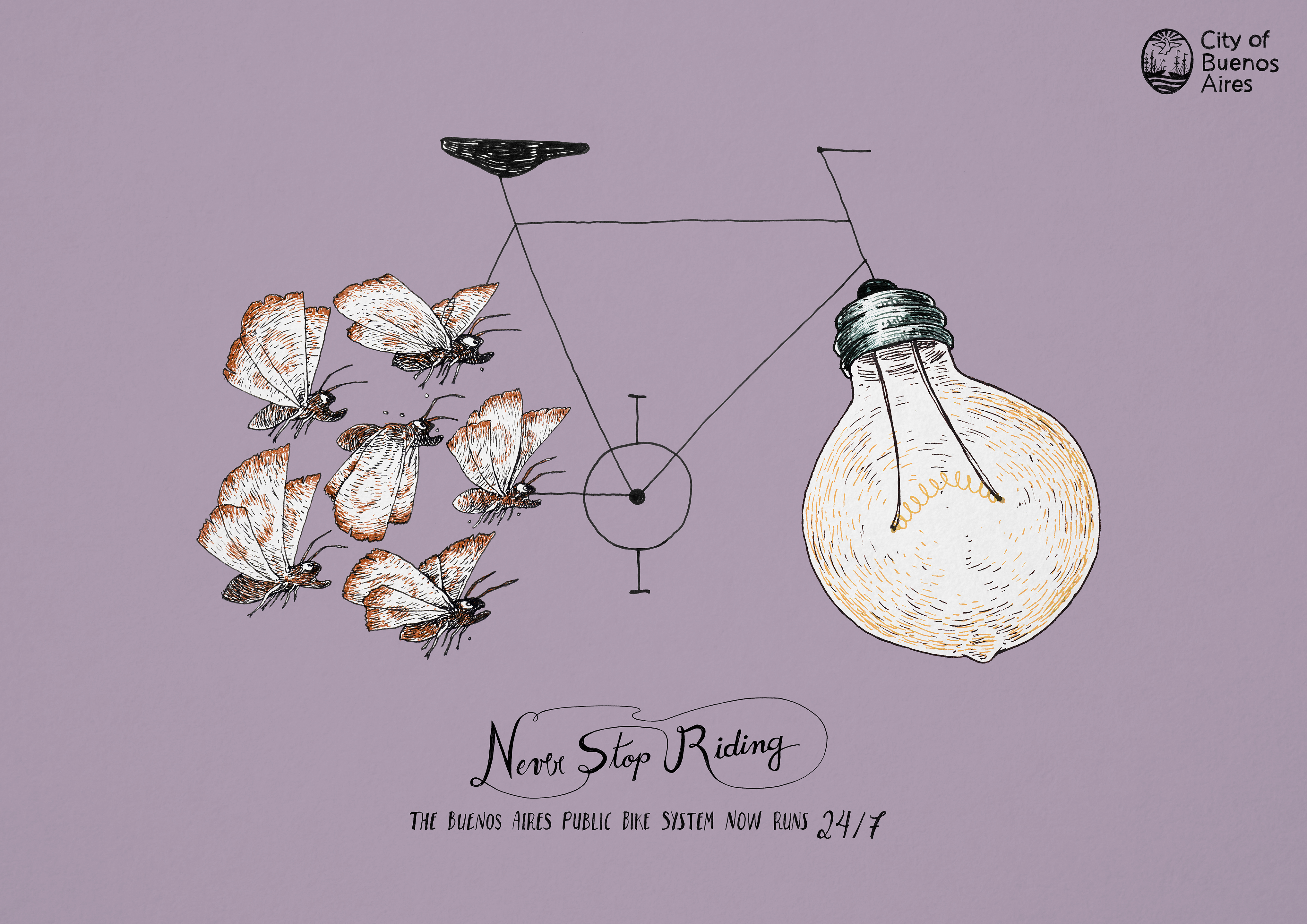 With a new public, automatic bicycle system available for use 24/7, it was time for Buenos Aires to get excited and start thinking of city bike as the way to be on-the-go, whenever they want. So we created an environmental campaign of clever, whimsical art that caught people’s eye while conveying the idea of a non-stop public biking system.